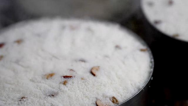 猪油白糖糕的制作方法每家每户也略有不同,通常是将米与糯米混合浸泡后打成粉末,加入白糖发酵。然后细细地过筛,再拌入猪油红枣核桃等配料,再蒸上几分钟,就成了一道香气四溢的甜食了。